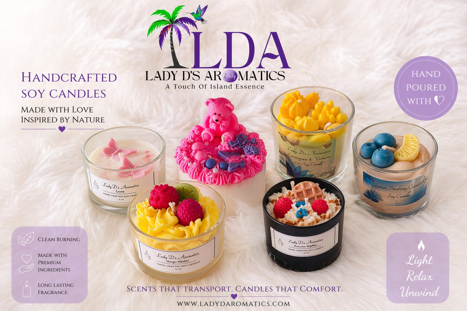 At Lady D’s Aromatics, every candle is hand-poured with intention and inspired by the beauty, rhythm, and soul of island life. From the first light to the final burn, each scent is crafted to transport you — whether it’s a peaceful escape, a memory of home, or a moment of pure relaxation.